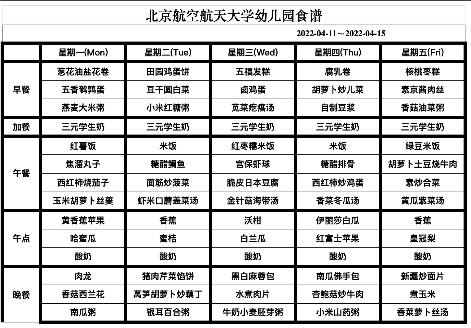 北航幼儿园幼儿食谱(2022年4月11日-4月15日)