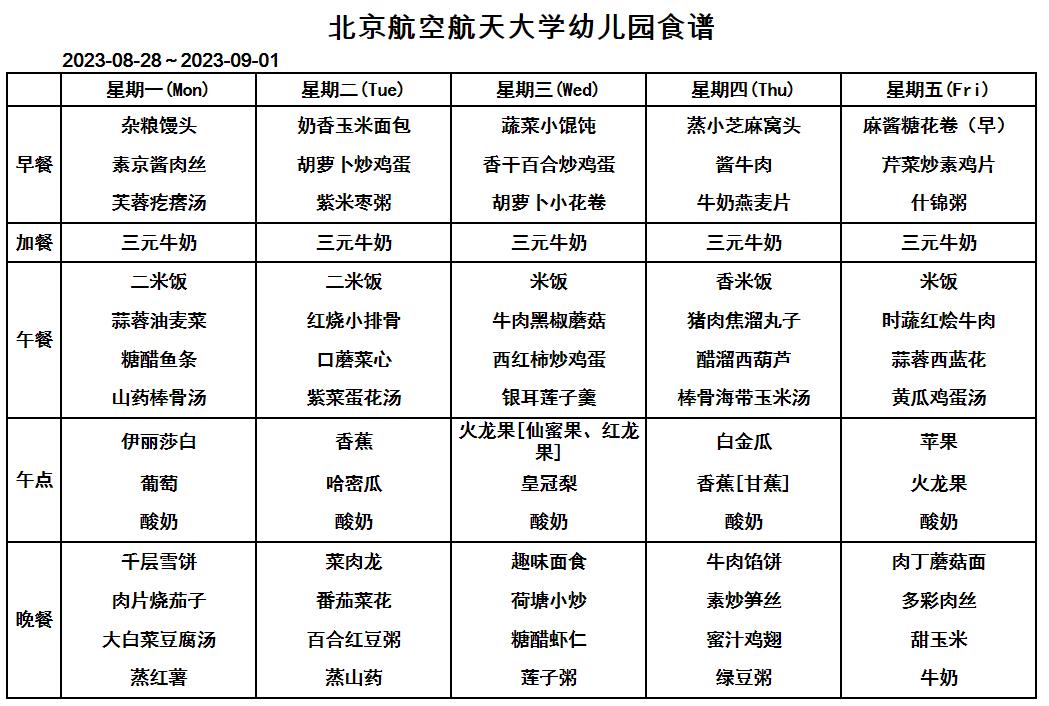 北航幼儿园幼儿食谱(2023年8月28日-9月1日)