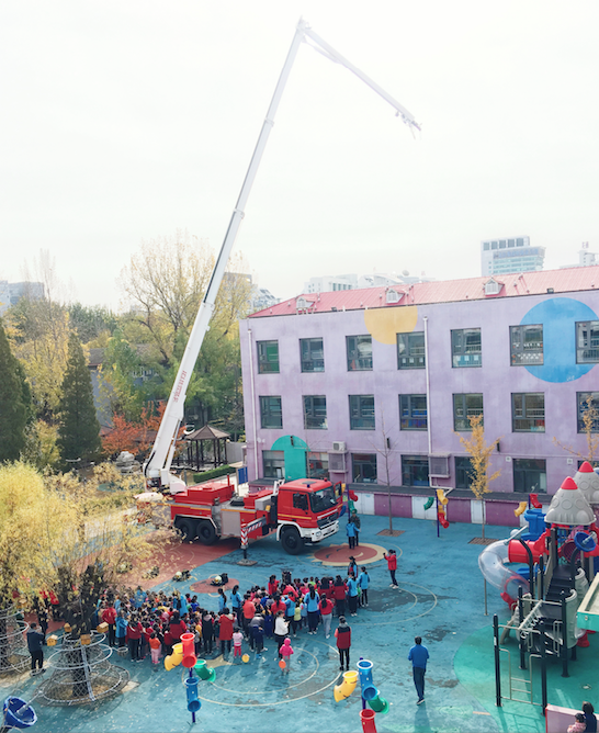在今年春天,消防车曾来到幼儿园,给孩子们留下十分深刻的印象。就在本周,我们又迎来北京市海淀区消防支队的队官兵驾驶着高压喷水消防车和云梯消防车再次到来,为全园教师与幼儿现场讲解消防知识。